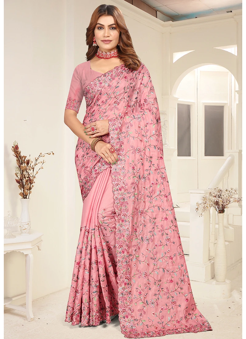 Peach Resham Embroidered Tussar Silk Saree